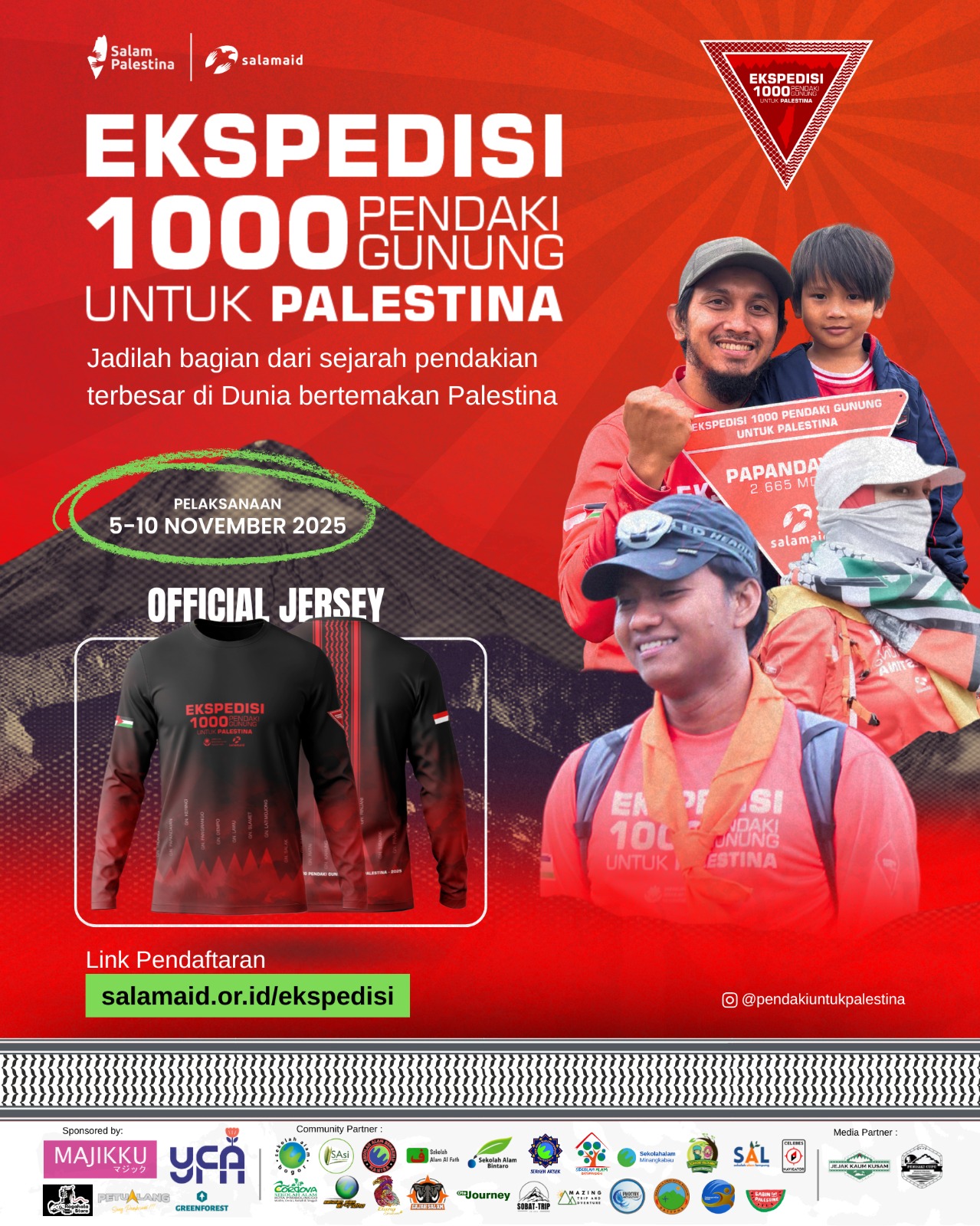 Ekspedisi pendakian untuk Palestina dengan peserta terbesar di Dunia, hadir untuk para pejuang yang siap berjuang bersama. Memacu adrenalin, menghadapi tantangan alam, cuaca berkabut dan ekstrim yang tidak ada apa apanya jika dibanding dengan kehancuran Gaza!